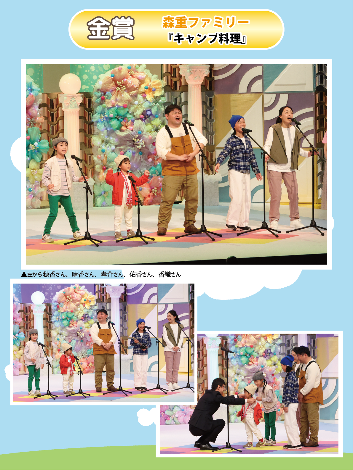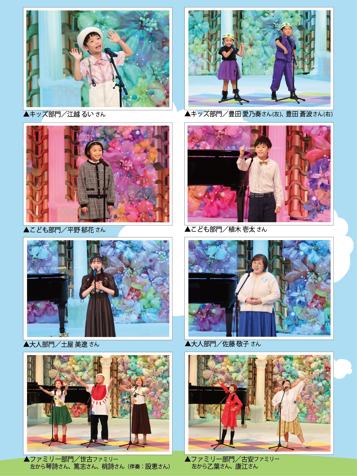 今回は、全国からおよそ3,500組の応募があり、一次・二次審査を勝ち抜いた、キッズ部門5組、こども部門5組、大人部門5組、ファミリー部門5組の計20組36名が出場。各組、練習を重ねてきた素晴らしい歌声を披露しました。